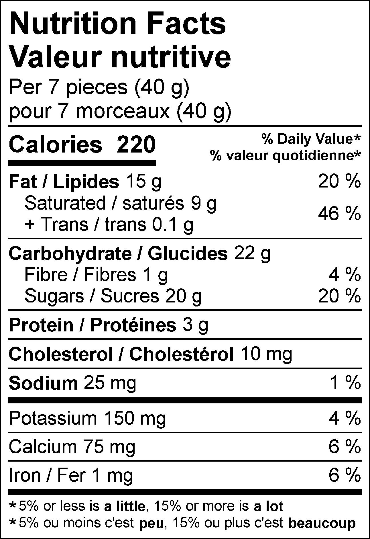 Sucre, Substances laitières, Beurre de cacao, Chocolat non sucré, Lécithine de soya, Extrait de vanille.