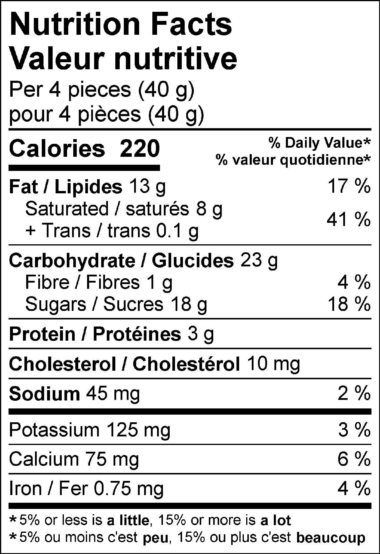Chocolat au lait (sucre, substances laitières, beurre de cacao, chocolat non sucré, lécithine de soya, extrait de vanille), Riz croustillant (farine de riz, sucre).